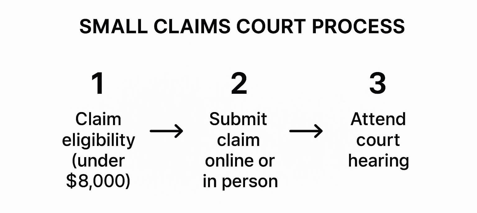 As the guide shows, for any claim under $8,000, the process is straightforward, from filing your initial paperwork to your day at the hearing.