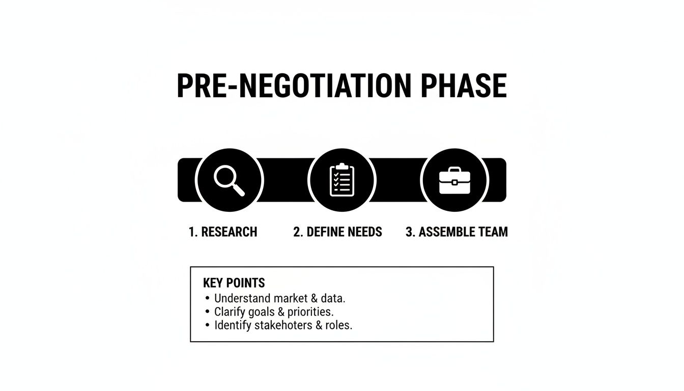 The essentials for your pre-negotiation process can be summarized into three core phases of preparation.