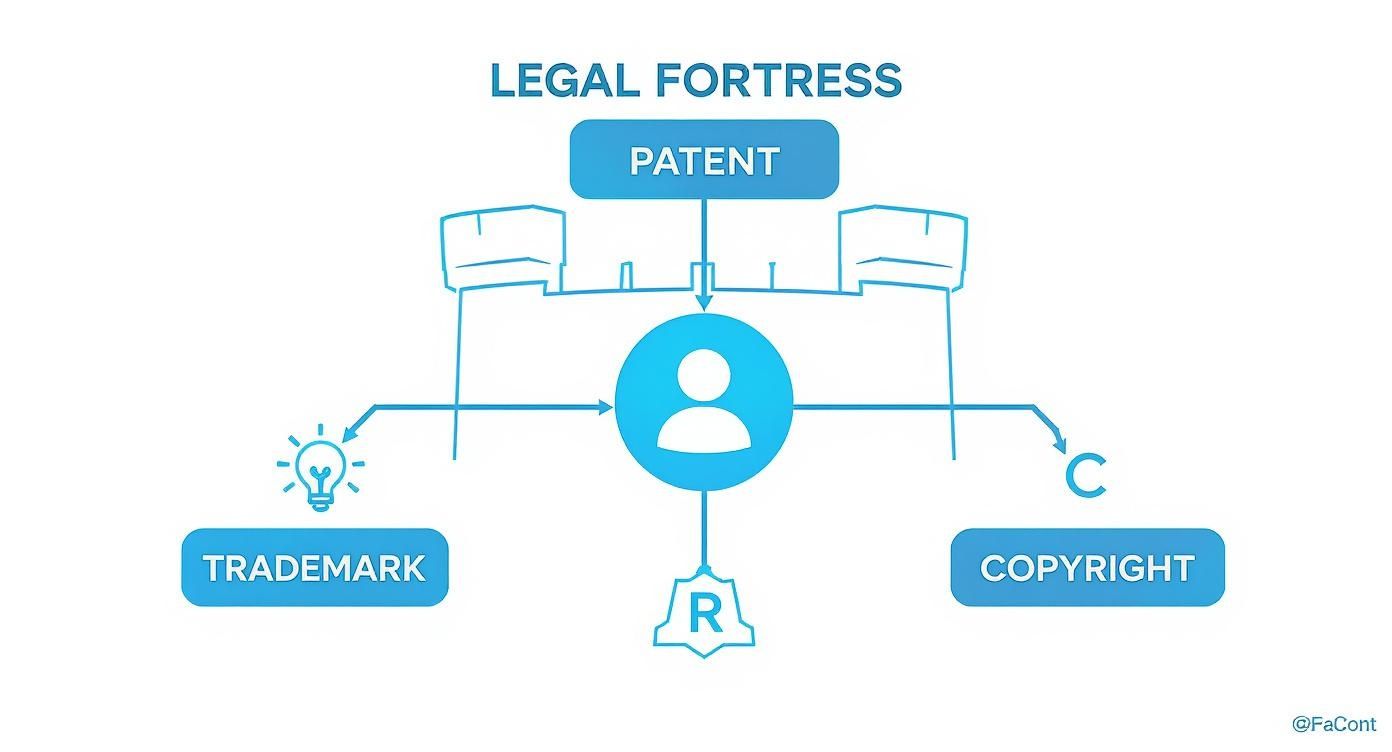 Before you can work effectively with an intellectual property attorney, you need to know what you’re protecting. Think of your IP portfolio as a fortress; it isn’t defended by a single wall but by four distinct legal fortifications. Each one—patents, trademarks, copyrights, and trade secrets—guards a different kind of asset. A seasoned attorney knows exactly which defense to deploy for any given situation.