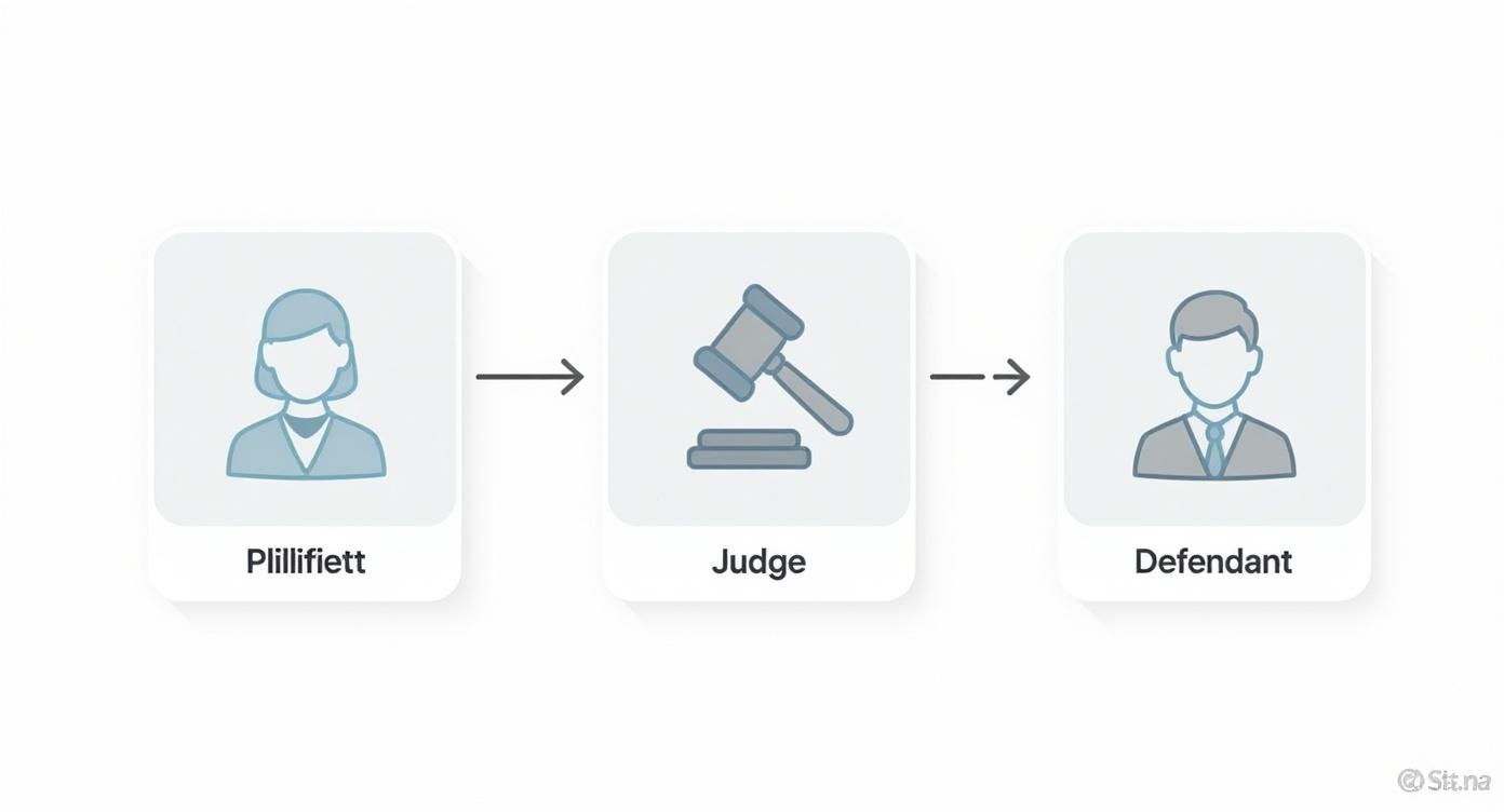 Each phase serves a specific purpose, building on the one before it to push the dispute toward a final resolution. The visual below shows the core relationship between the plaintiff (who initiates the case), the defendant (who responds), and the judge who oversees it all.