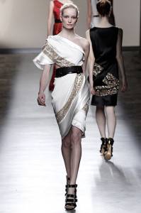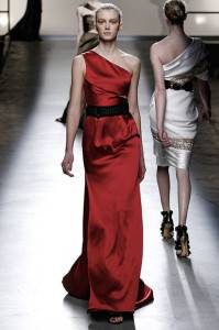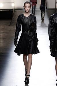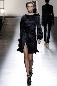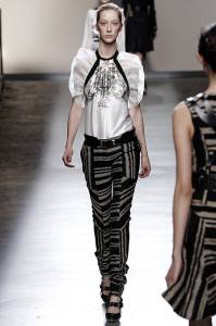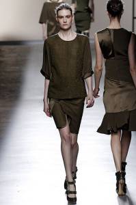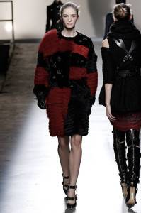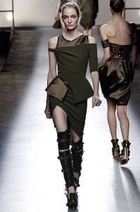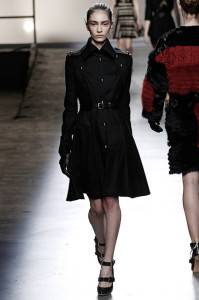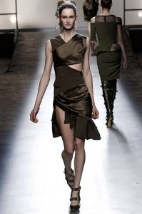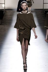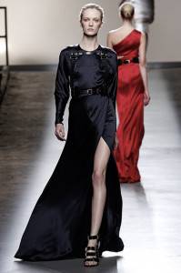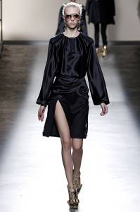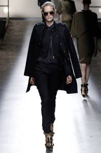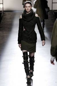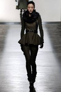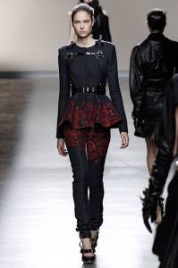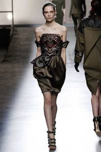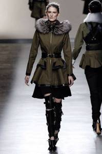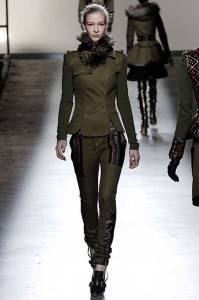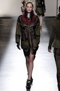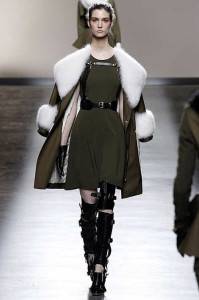 Perfectly tailored trousers complemented structured jackets with nipped waists, peplums in thick wool, fur collars, and leather harnesses. From the more ready-to-wear pieces to the dresses, feminine detailing reigned supreme. Long-sleeve gowns of draped silk were accented by adjustable army-style harnesses, while long, fluid dresses with sharp cut-outs were nothing short of bombshell gorgeous. Intricate brocade needlework, bohemian patterns and splashes of bold red complemented the otherwise military-issue palette of olive, navy, black, and white.