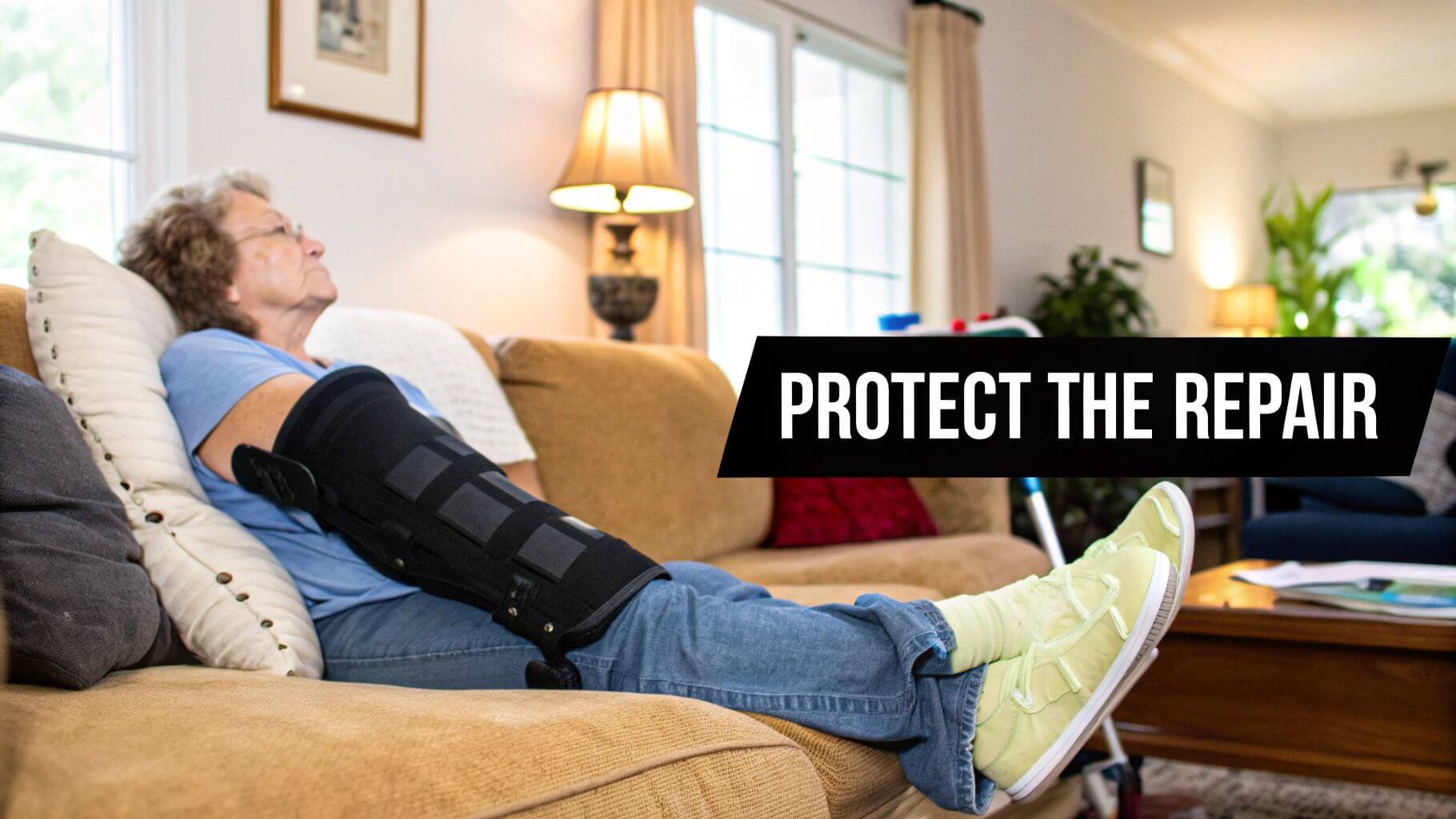Your only jobs are to manage pain, crush the swelling, and keep every ounce of weight off that foot. You’ll be immobilized in a splint or cast, positioned to keep the tendon slack and totally free of tension. This protective shell is your tendon’s bodyguard, and following your surgeon’s instructions to the letter is non-negotiable.