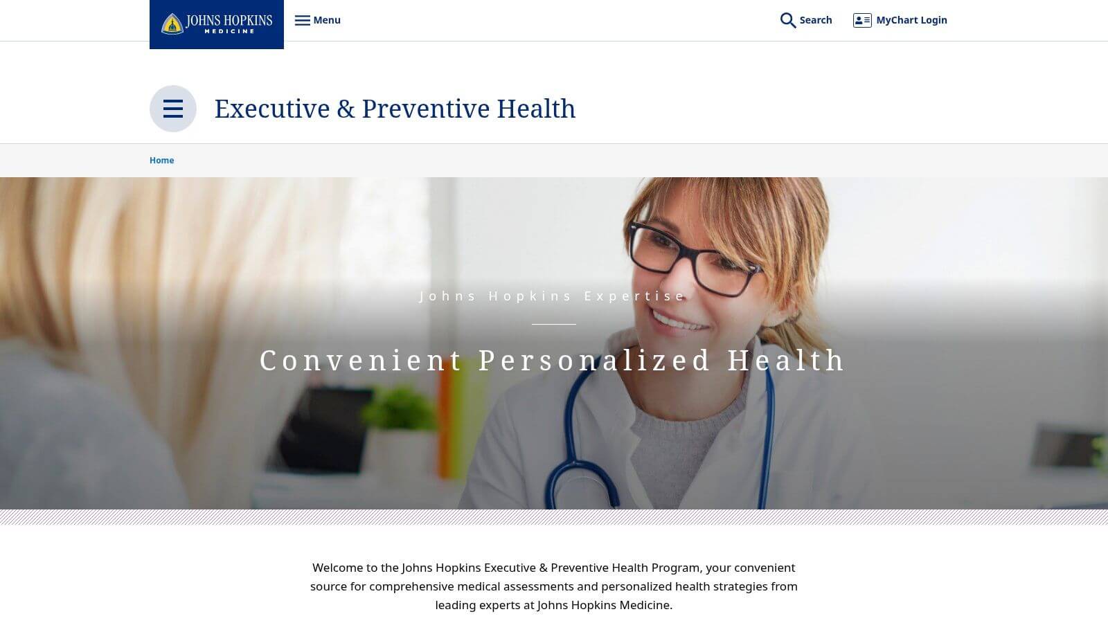 The Johns Hopkins Executive & Preventive Health program delivers an academically rigorous and highly efficient health assessment from one of the world’s most respected medical institutions. Designed for busy leaders, the program consolidates a comprehensive, risk-based evaluation into a single, seamless day at The Johns Hopkins Hospital in Baltimore. This makes it one of the best executive health programs for individuals who value the combination of world-class medical insight and extreme time efficiency.