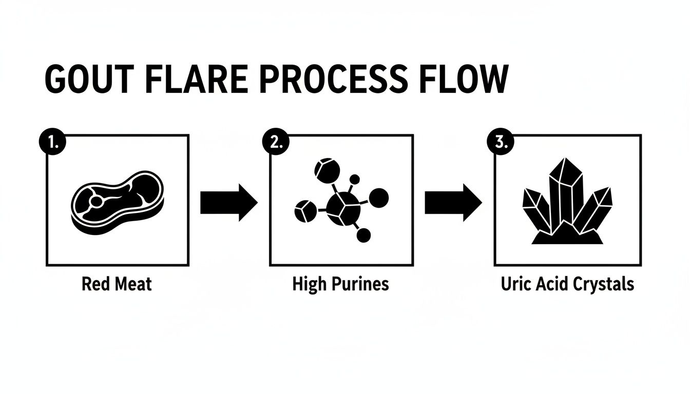 As you can see, the high purine content in red meat is the direct starting point for the uric acid crystals that kick off a gout flare.