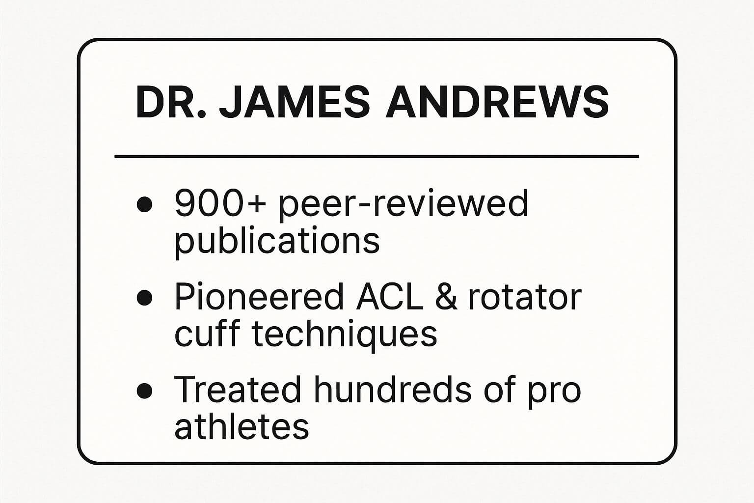 | Dr. James Andrews | High: advanced arthroscopic & multi-disciplinary techniques | High: specialized surgical team, surgical facilities | Excellent: high recovery rates, reduced rehab time | Elite athletes needing complex joint repairs | Pioneered ACL & rotator cuff techniques; broad elite athlete experience |