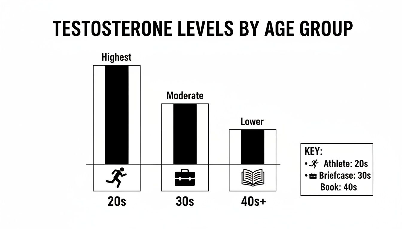 This chart gives you a quick visual of how testosterone levels naturally shift over a man’s life, showing the peak in the 20s and the steady decline that follows.