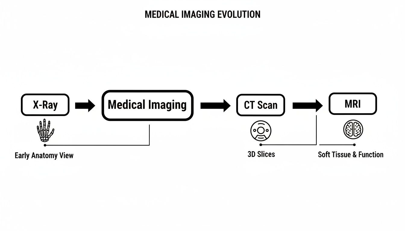 To grasp the scale of this change, consider the sheer volume of data. In the late 2010s, American hospitals were performing an estimated 84 million CT scans and over 40 million MRI exams every single year. That’s a staggering increase from virtually zero before the 1970s and 80s—a trend of double-digit annual growth that shows the incredible expansion in medical imaging. You can explore the history and innovation of medical radiation to fully appreciate this journey.