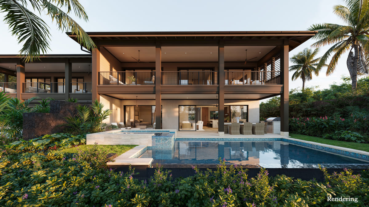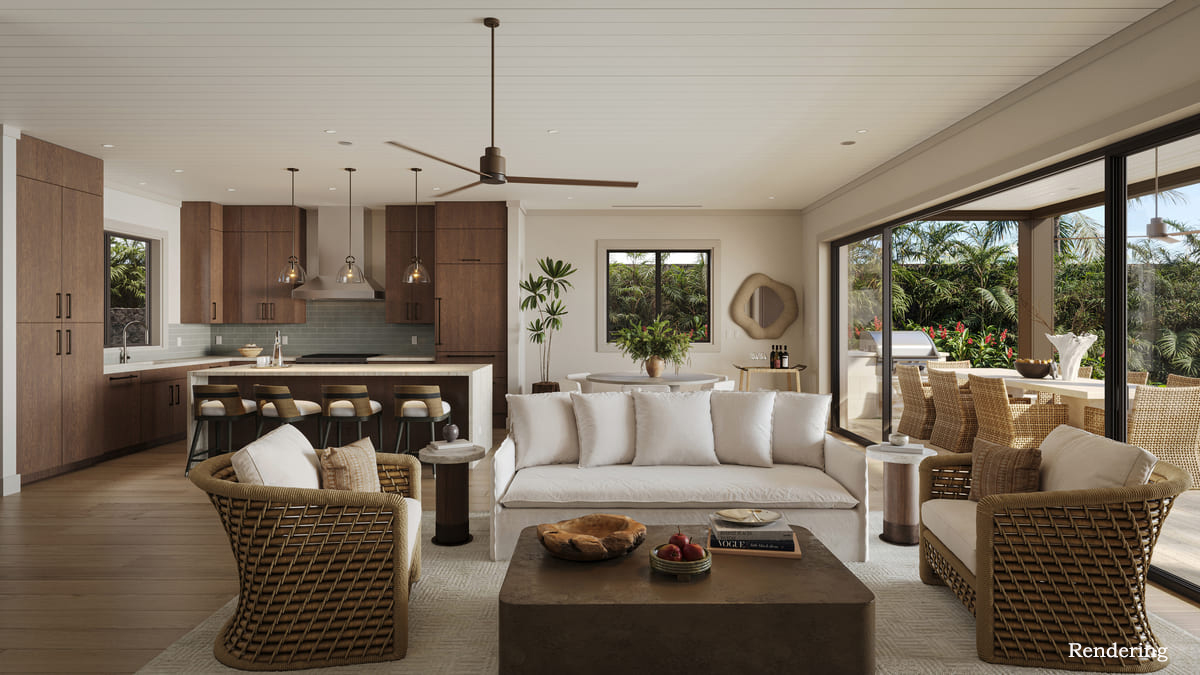 This townhome features a gourmet kitchen with bar seating and top-of-the-line Wolf and Sub-Zero appliances. The expansive great room flows effortlessly to a covered lanai, private pool and spa, creating a seamless indoor/outdoor entertainment haven that defines the effortless Kohanaiki lifestyle. A detached `ohana above the garage provides versatile space for guests, extended family, or a private retreat.
