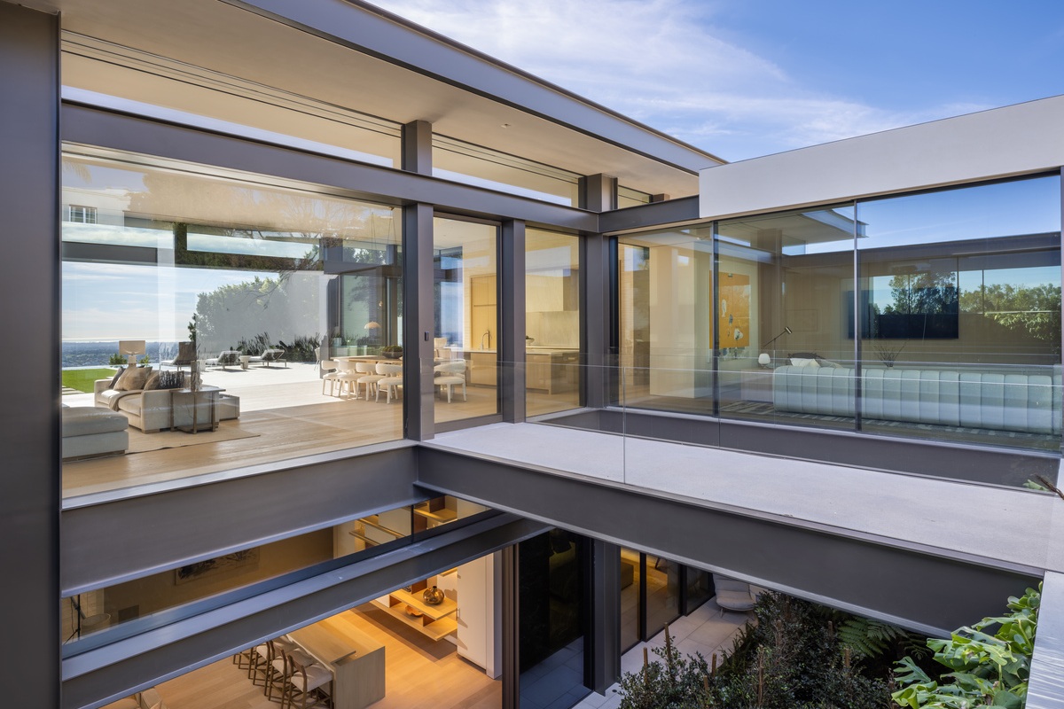 Spanning approx. 13,400 sq.ft. of living space with 7 bedrooms and 9 bathrooms, there is ample space for friends, family, staff, and entertaining. Offering privacy and security, a gated driveway leads to a subterranean 8-car garage and the gated front entryway leads to the glass front door across a bridge spanning above the lower level interior courtyard oasis.